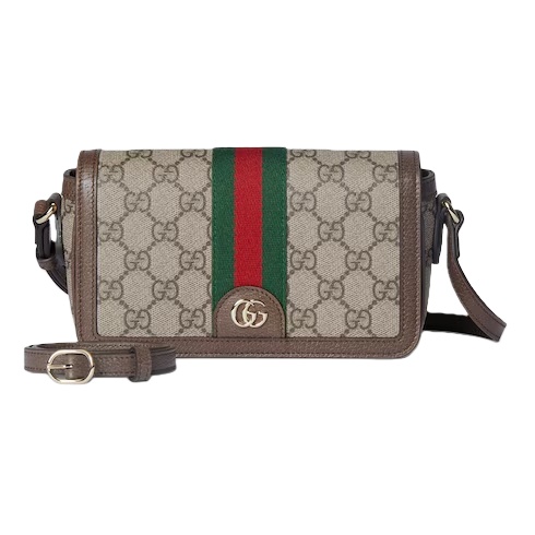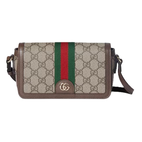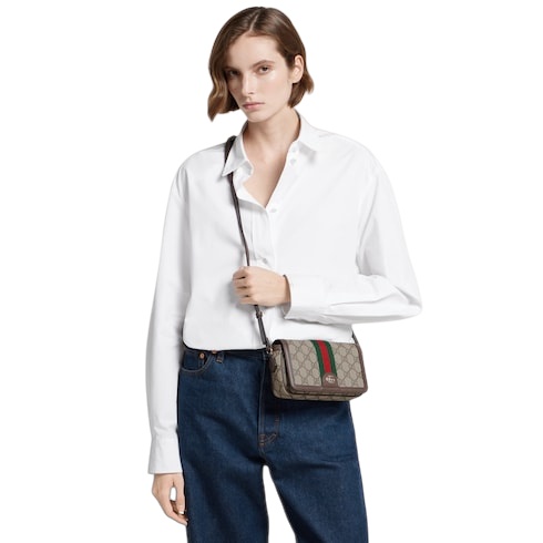 The Ophidia collection evokes the House’s heritage with the signature Web stripe and Double G emblem in light gold-toned finish. The styles are crafted from soft GG Monogram coated fabric, featuring green cotton lining inside. The flap features an emblematic Web trim.