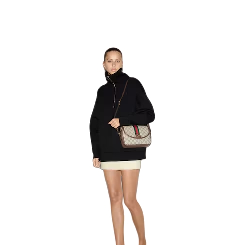 The Ophidia is reinvented in new and unexpected ways. Metal eyelets and studs define the historical silhouette to create a one-of-a-kind take on the archival style. Creating a playful contrast, the small-sized shoulder bag is crafted from the House's signature GG Supreme in the traditional color combination of beige and dark brown.