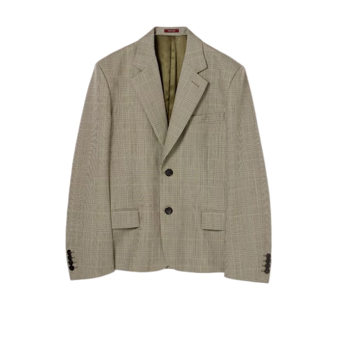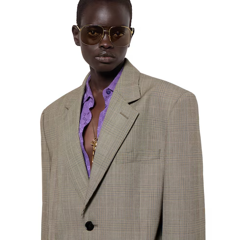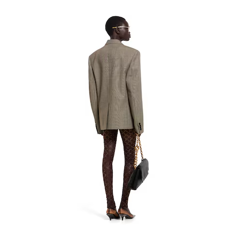 Blending archival influences with the opulence of the 1990s, the collection pairs strong, structured shoulders with sleek, form-fitting silhouettes designed to transition from day to night. Crafted from Prince of Wales wool, this single-breasted jacket is finished with a front button closure.