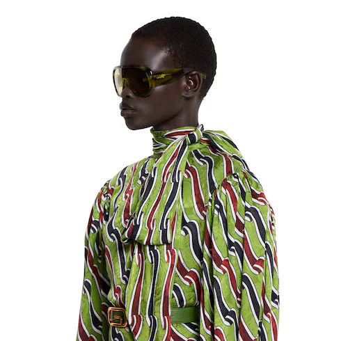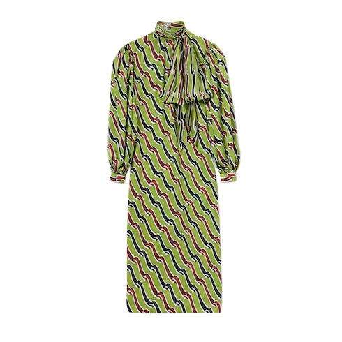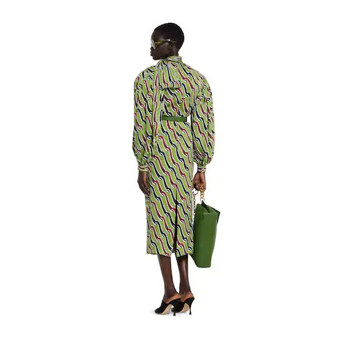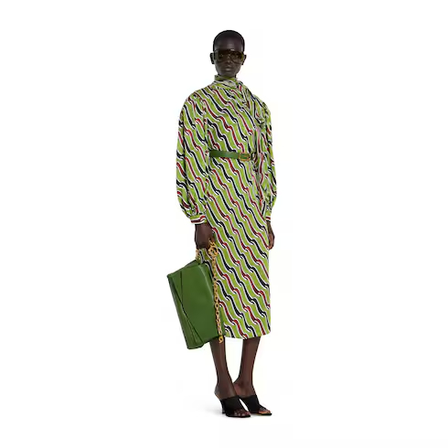 In the Cruise 2026 collection, structure meets sensuality in wide-shoulder silhouettes that command attention. Crafted from multicolor silk, this dress is defined by an allover ribbon print.