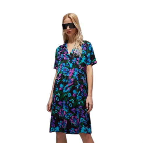This style is part of the Gucci Primavera collection. The House's emblematic Flora motif is vibrantly reinterpreted on this regular-fit chemisier dress. Crafted from a silk-viscose jacquard base with an allover Gucci floral print, this colorful yet versatile style is complete with a crisp shirt collar, short sleeves and front pockets.