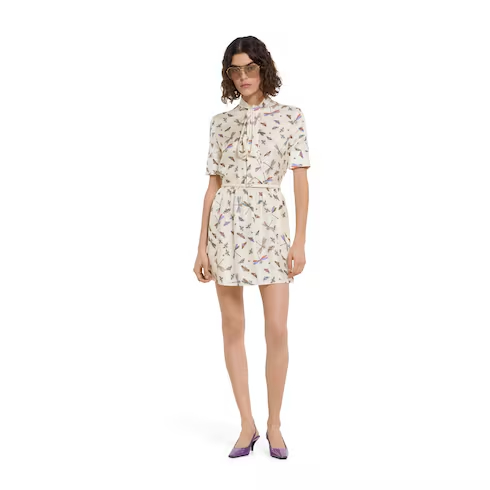 In the Cruise 2026 collection, the House's rich archive of silk foulards imbues ready-to-wear with contemporary sensibility. Floral motifs, gold-toned chains, travelling-inspired subjects are reimagined across fluid silhouettes. Crafted from silk twill, this dress is defined by an allover fauna print.