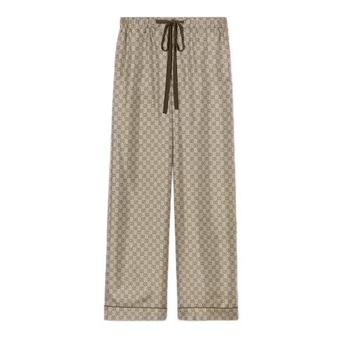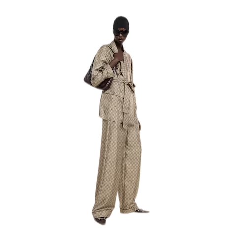 Introducing Spring Summer 2026. This style is inspired by the "La Primadonna" look of La Famiglia. The collection reinterprets the House’s codes through singular personalities and distinctive aesthetic attitudes. Crafted from silk twill, these leisure pants are defined by an allover GG print.