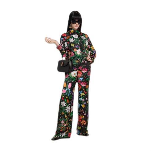 Introducing Spring Summer 2026. This style is inspired by the "La Contessa" look of La Famiglia. The collection reinterprets the House’s codes through singular personalities and distinctive aesthetic attitudes. Crafted from silk twill, this pair of pants is defined by an allover Gucci Flora print.