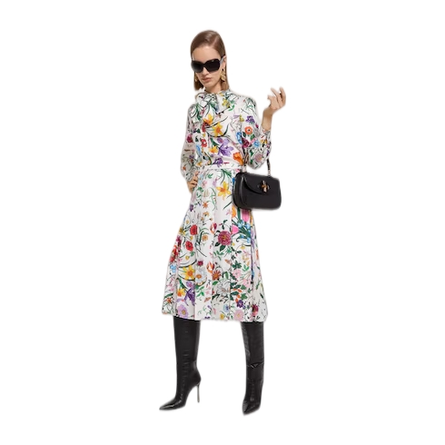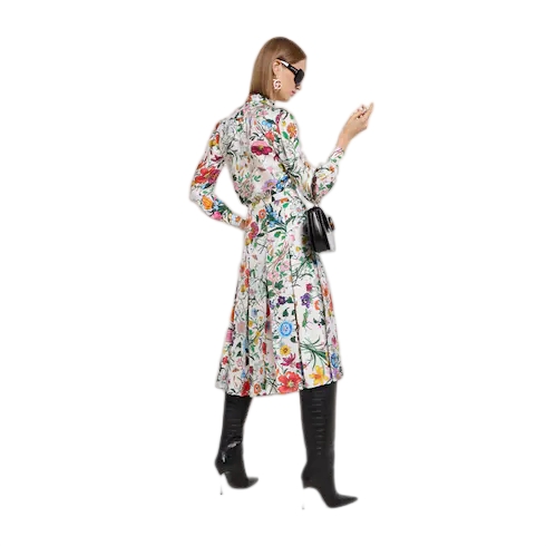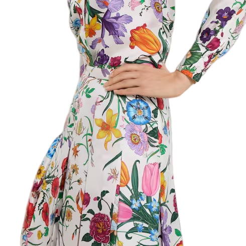 Introducing Spring Summer 2026. This style is inspired by the "La Flora" look of La Famiglia. The collection reinterprets the House’s codes through singular personalities and distinctive aesthetic attitudes. Crafted from silk twill, this pleated skirt is defined by an allover Gucci Flora print.