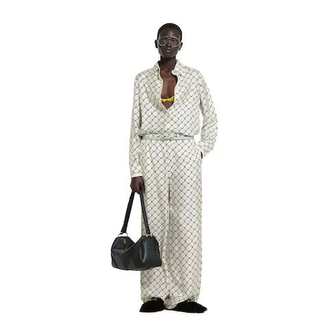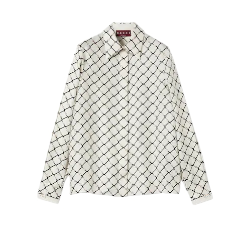 The Cruise 2026 women's ready-to-wear collection reimagines archival motifs with innovative prints, in a vibrant palette. Crafted from white silk twill, this shirt is defined by an allover Gucci Horsebit print.