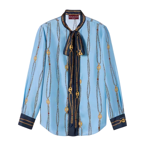 Body-conscious silhouettes, minimal lines, and athletic influences channel the bold energy of 1990s fashion, a main theme in the Cruise 2026 women's ready-to-wear collection. Crafted fro silk twill, this shirt is defined by an allover Gucci marina chain print.
