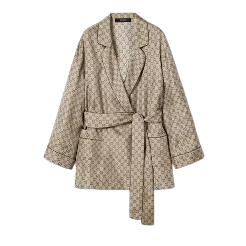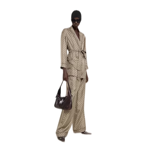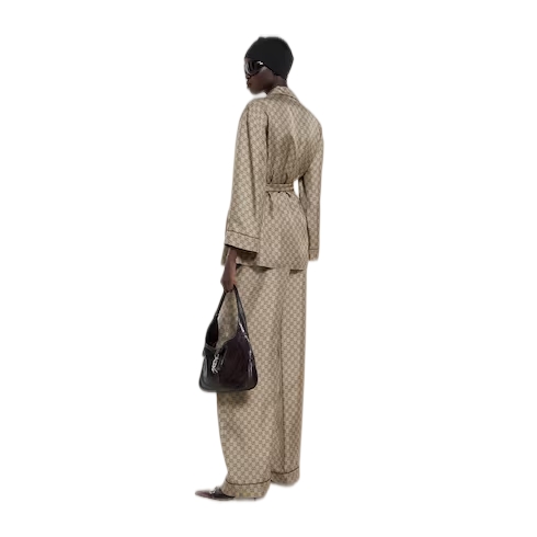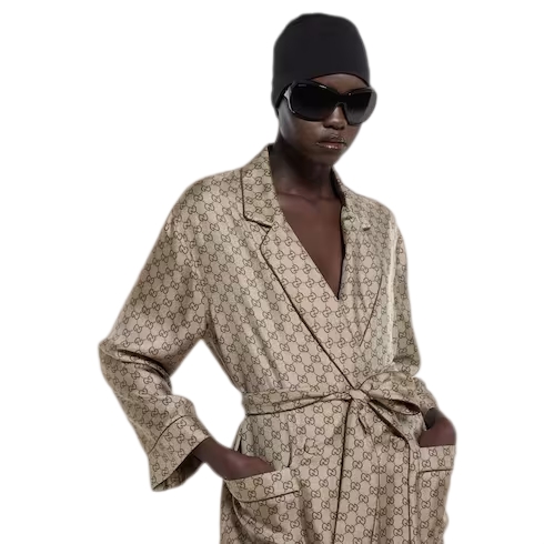 Introducing Spring Summer 2026. This style is inspired by the "La Primadonna" look of La Famiglia. The collection reinterprets the House’s codes through singular personalities and distinctive aesthetic attitudes. Crafted from silk twill, this shirt is defined by an allover GG print.