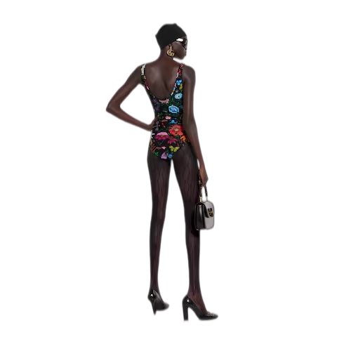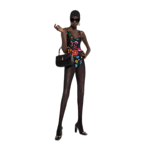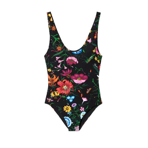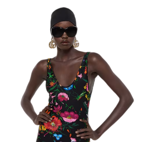 Introducing Spring Summer 2026. This style is inspired by the "La Contessa" look of La Famiglia. The collection reinterprets the House’s codes through singular personalities and distinctive aesthetic attitudes. Crafted from sparkling jersey, this swimsuit is defined by an allover Gucci Flora print.