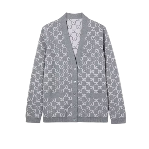 The Cruise 2026 women's ready-to-wear collection transitions into a new season with bright colors which take center stage across GG motif knitwear. This reversible V-neck cardigan is crafted from light pink and grey GG fine wool jacquard.