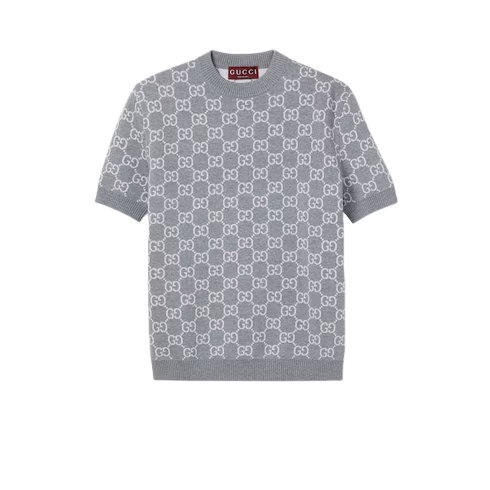 The Cruise 2026 women's ready-to-wear collection transitions into a new season with bright colors which take center stage across GG motif knitwear. This reversible top is crafted from light pink and grey GG fine wool jacquard.