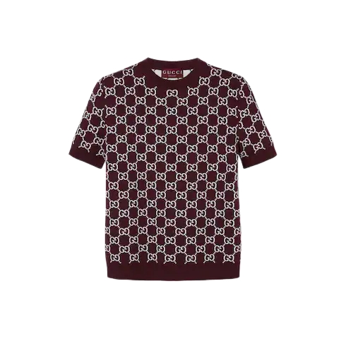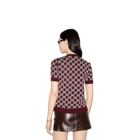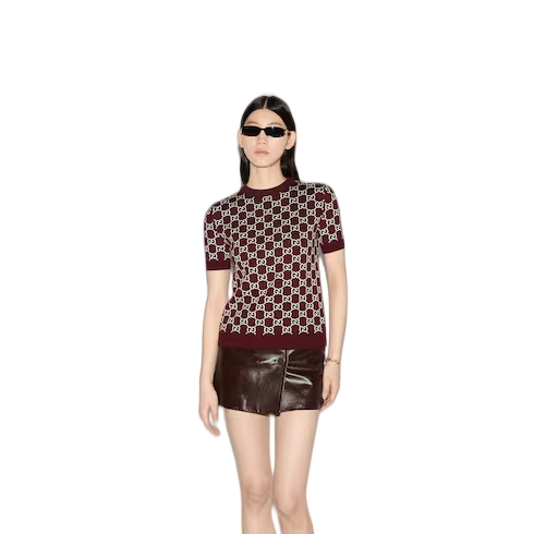 The GG motif appears in unexpected colors and fabric combinations, from linen blend to nylon. This reversible crewneck top has been crafted from a GG fine wool jacquard, revealing an inverse color palette on the reverse.