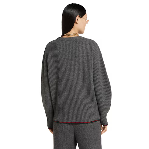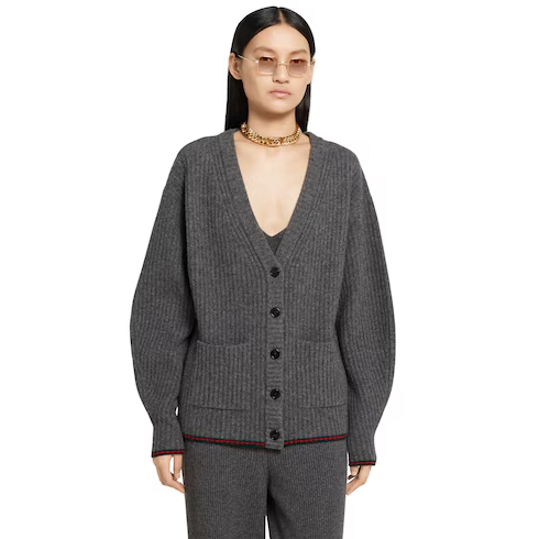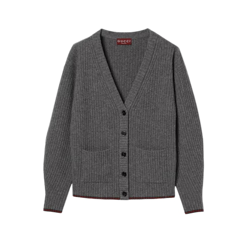 The Pre-fall 2025 collection introduces a new take on warm materials on sophisticated leisure pieces, in traditional and contemporary silhouettes. This loose v-neck cardigan is crafted from a soft rib felted wool style and is complete with the archival Web trim.