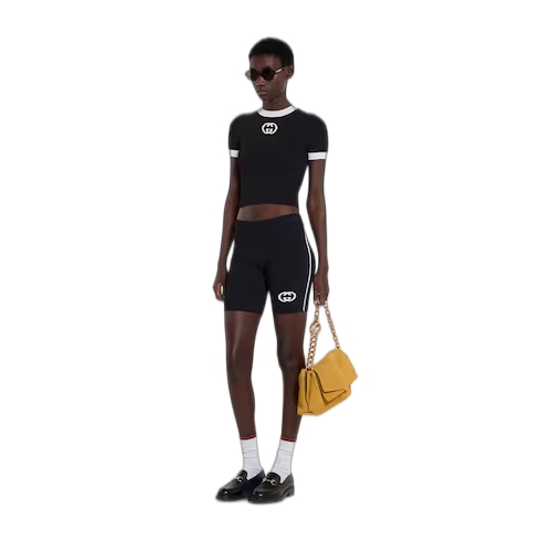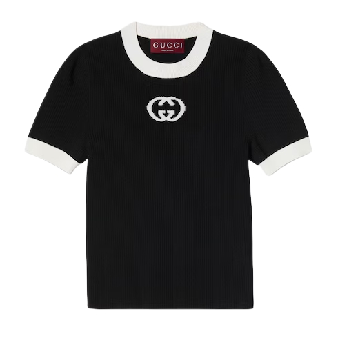 The Cruise 2026 women's ready-to-wear collection celebrates the Gucci wardrobe, blending archival influence with the history of Florence in a playful mélange, ranging from the minimal to the maximal. Crafted from fine rib viscose, this T-shirt is defined by an Interlocking G intarsia.