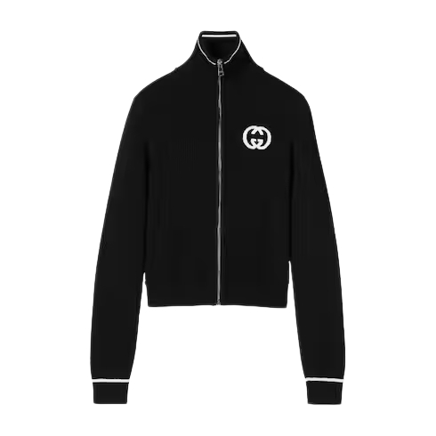 The Cruise 2026 women's ready-to-wear collection celebrates the Gucci wardrobe, blending archival influence with the history of Florence in a playful mélange, ranging from the minimal to the maximal. Crafted from fine rib viscose, this zip jacket is defined by an Interlocking G intarsia.