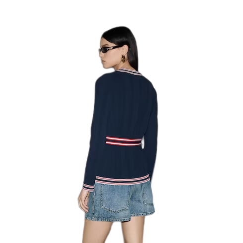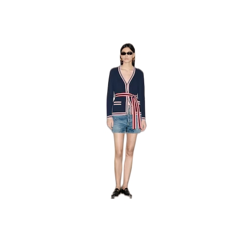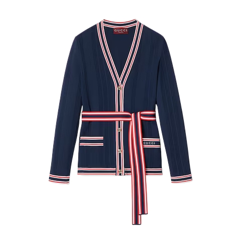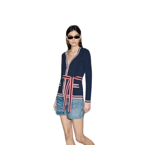 Inspired by the summer spirit and beach clubs on the Italian coast, this item is part of Gucci Lido. Tops and bottoms from jersey to denim and other materials open up numerous styling possibilities. This self-tie cardigan appears in a fine stretch viscose, allowing for easy movement and wear. A contrasting stripe trim and Gucci embroidery completes the design with a refined nod to the House.