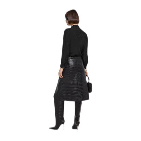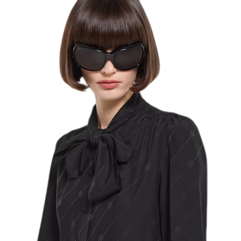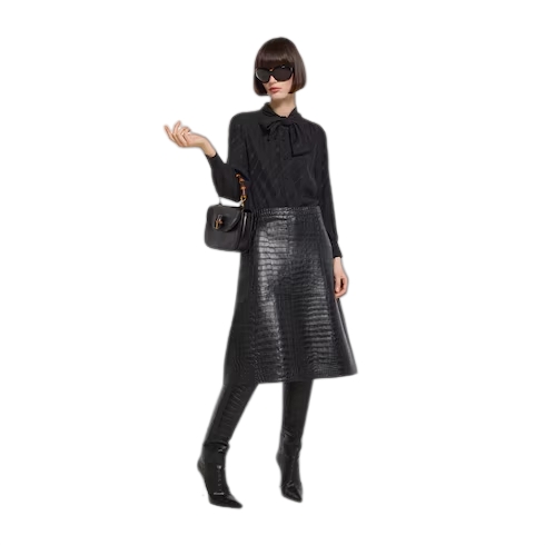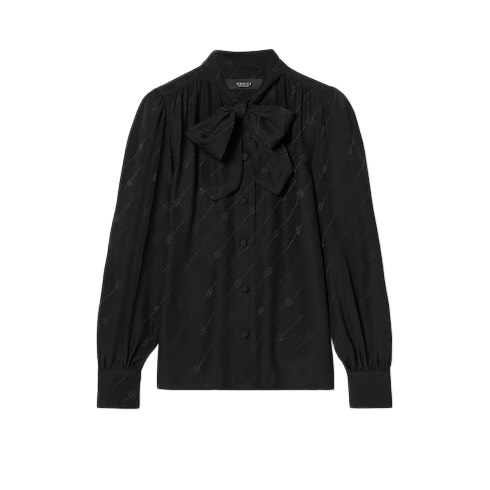 Introducing Spring Summer 2026. This style is inspired by the "La Gallerista" look of La Famiglia. The collection reinterprets the House’s codes through singular personalities and distinctive aesthetic attitudes. This shirt is presented in silk crêpe satin Interlocking G jacquard.