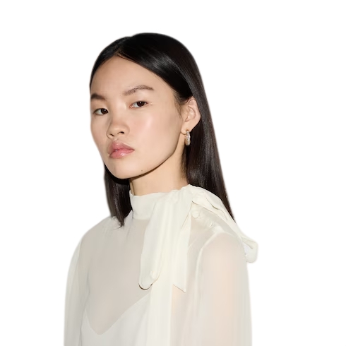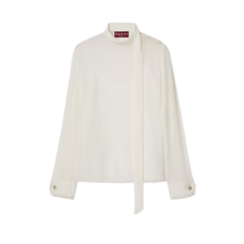 Fringes, beads, crystals and other highly artisanal details characterize the House approach to the everyday wardrobe, expressed through inspirations and distinctive codes. This elegant top has been crafted from a light silk georgette and enriched with crystal Double G buttons. A detachable crêpe de chine camisole offers increased versatility.
