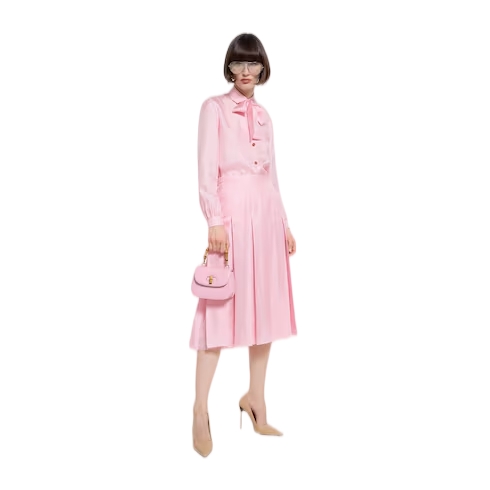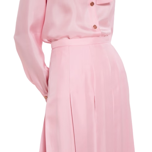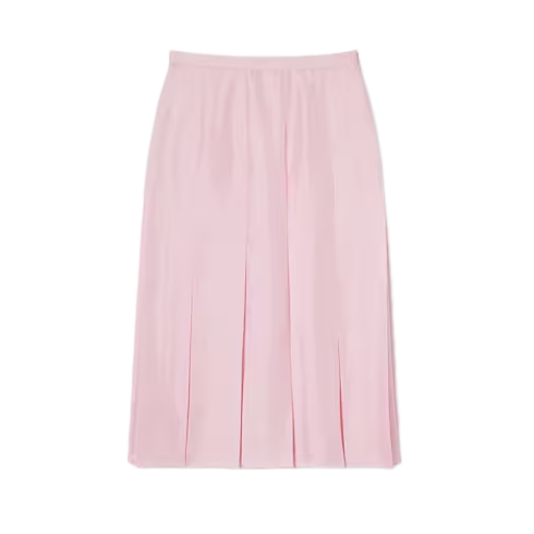 Introducing Spring Summer 2026. This style is inspired by the "La Principessa" look of La Famiglia. The collection reinterprets the House’s codes through singular personalities and distinctive aesthetic attitudes. This pleated midi skirt is presented in light pink silk twill.