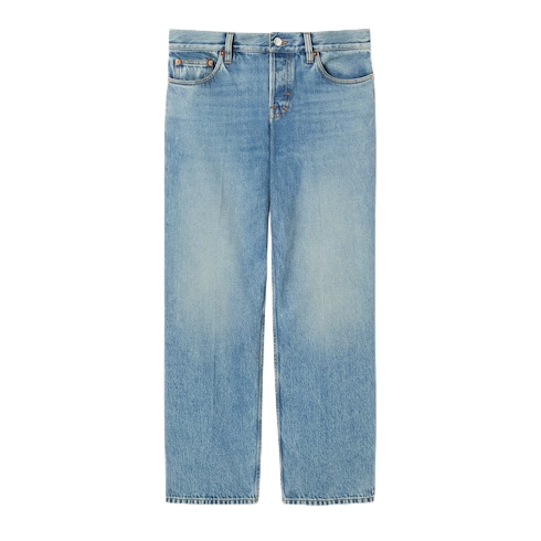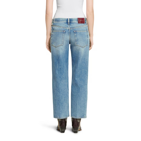 The Pre-Fall 2025 collection introduces a fresh take on denim, with subtle details that elevate everyday looks. Cut from a washed certified cotton denim, these straight fit pants are enriched with a Gucci Rosso Ancora naplak label.