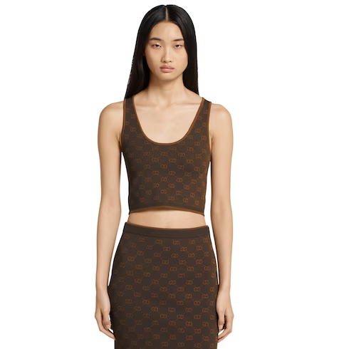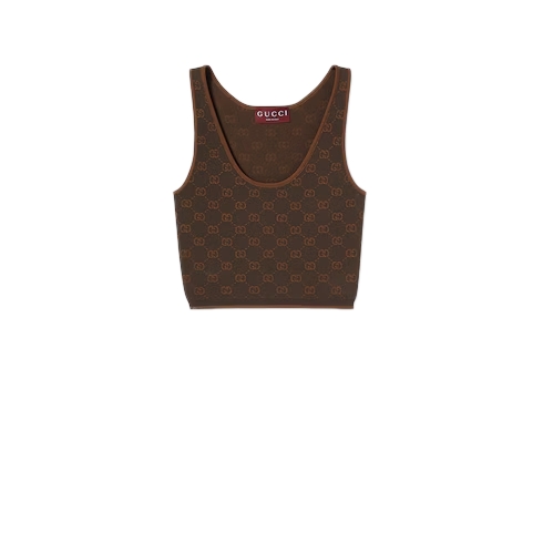 The House's heritage motifs are presented on a backdrop of sophisticated textures, from off-duty denim to lightweight materials, for the Pre-Fall 2025 collection. The GG motif appears here as a jacquard detail atop a sporty tank top in stretch viscose.