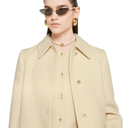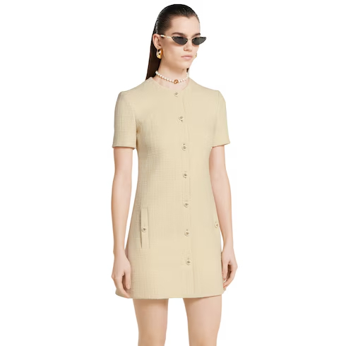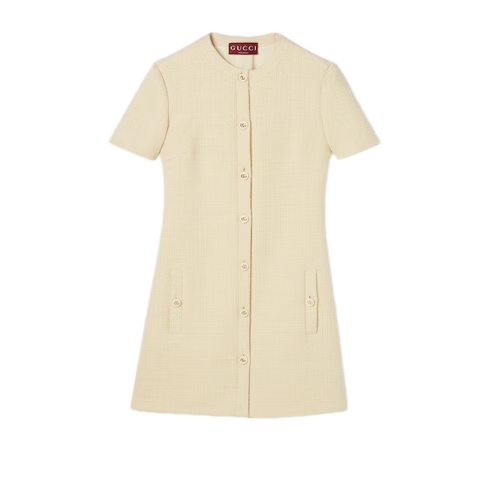 Coats, jackets, and dresses blend discreet elegance with refined details in the Pre-Fall 2025 collection. This dress appears in textured wool tweed with a bon-ton feel. Gold-toned Double G buttons and two subtle side pockets add to the elegance of the piece.