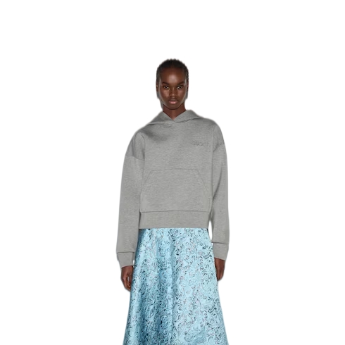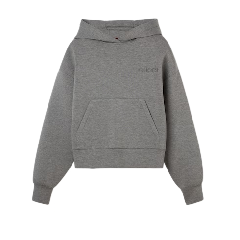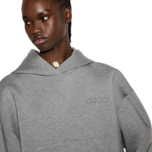 Signature patterns have been reenvisioned in unexpected versions, juxtaposed with new silhouettes on jackets, oversized shirts and pajama ensembles. This oversized hooded sweatshirt is made from viscose jersey and enriched with a Gucci embroidery.