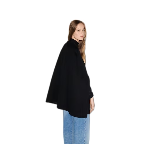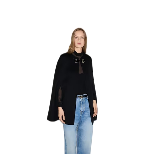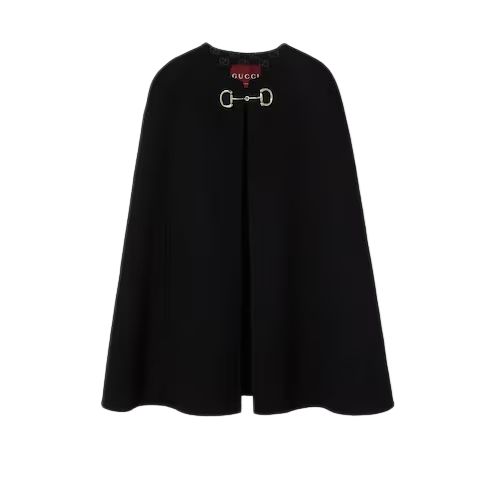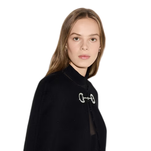 The Gucci Cruise 2025 collection features minimalist garments in either total white or total black, introducing finely constructed pieces in an essential palette. Crafted from a double faced wool and silk fabric, this voluminous cape is defined by a silver-toned Horsebit closure.