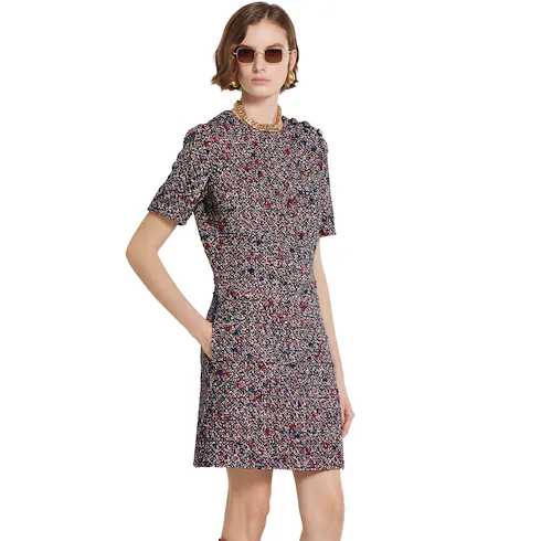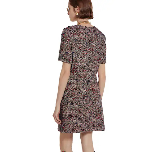 Coats, jackets, and dresses blend discreet elegance with refined details in the Pre-Fall 2025 collection. This dress in wool bouclé has a distinctive bon-ton feel, accentuated by the gold-toned enamel GG buttons.