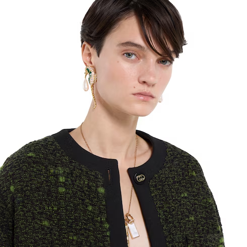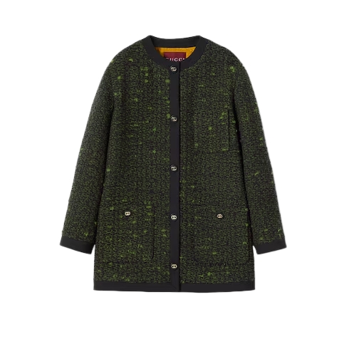 The statement cardigan jacket is a key silhouette of the Cruise 2026 collection. It can be worn on top of a contrasting color, or paired with a mini skirt for harmonious proportions. Crafted from green and black wool bouclé, this jacket is finished with Interlocking G buttons.