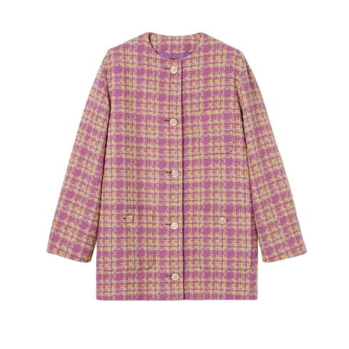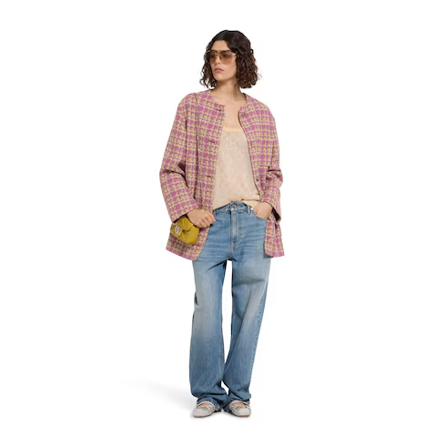In the Cruise 2026 collection, women's ready-to-wear pieces transition into a new season with a breath of spring attitude and romantic energy, blending softness with structure. Crafted from wool bouclé, this jacket is enriched with Interlocking G metal buttons.