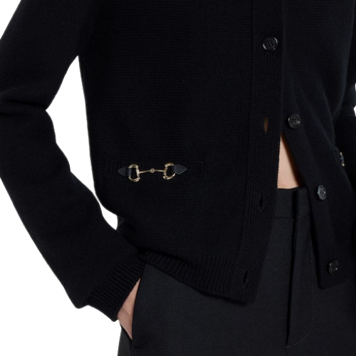 The statement cardigan jacket is a key silhouette of the season. It can be worn on top of a contrasting color, or paired with a mini skirt for harmonious proportions. Crafted from wool cashmere, this cardigan is enriched with an Horsebit detail.