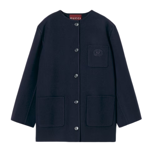 The Pre-fall 2025 collection introduces a new take on warm materials on sophisticated outerwear pieces, in traditional and contemporary silhouettes. This collarless coat is crafted from a wool blend and features an Interlocking G embroidered detail.