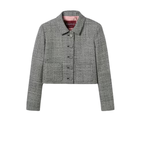 The Cruise 2026 collection blends archival inspirations with 1990s opulence. Silhouettes with a strong, structured shoulder are combined with fitted pieces from day to night. Tailored in black and white wool grisaille, this jacket is finished with a signature Interlocking G button.