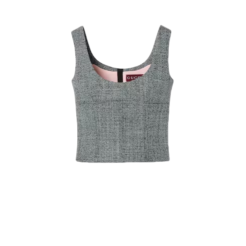 The Cruise 2026 women's ready-to-wear collection celebrates the Gucci wardrobe, blending archival influence with the history of Florence in a playful mélange, ranging from the minimal to the maximal. This top is crafted from black and white wool grisaille.
