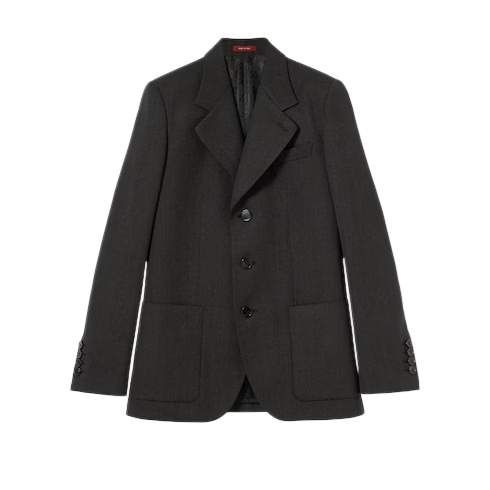 In the Fall Winter 2025 collection, tailoring embraces heritage codes with a contemporary touch. This single-breasted jacket features a notch lapel, front button closure and a structured silhouette. The design is completed by a chest welt pocket and two large patch pockets.