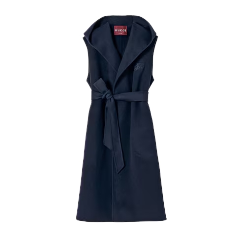 The Pre-fall 2025 collection introduces a new take on warm materials on sophisticated outerwear pieces, in traditional and contemporary silhouettes. This sleeveless coat, with tie waist, is crafted from a wool blend and features an Interlocking G embroidered detail.