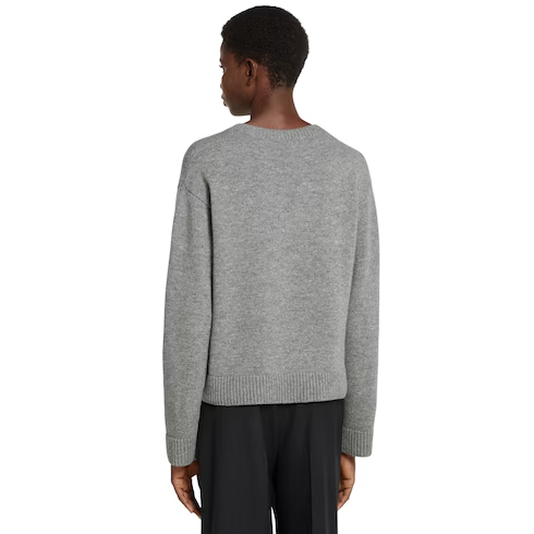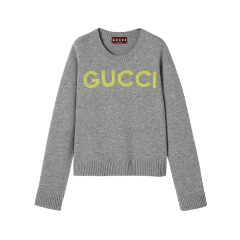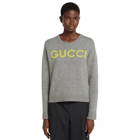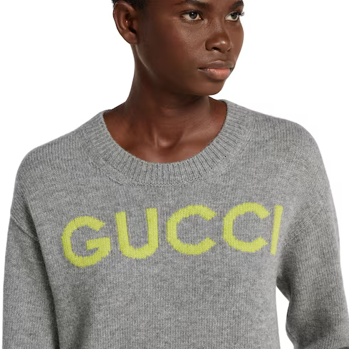 The Gucci logo appears in unexpected colors and fabric combinations, from linen blend to wool. This crewneck top is presented in a grey wool and enriched with a 'Gucci' intarsia.
