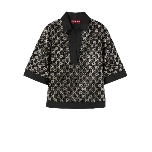 The Cruise 2026 women's ready-to-wear collection highlights sumptuous materials on essential silhouettes to usher in the colder season. Crafted from black light wool tweed lamé, this top is enriched with GG crystals.