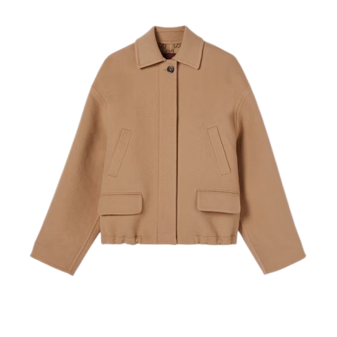 The Pre-fall 2025 collection introduces a new take on warm materials on sophisticated outerwear pieces, in traditional and contemporary silhouettes. This zip jacket is in wool with a GG interior.