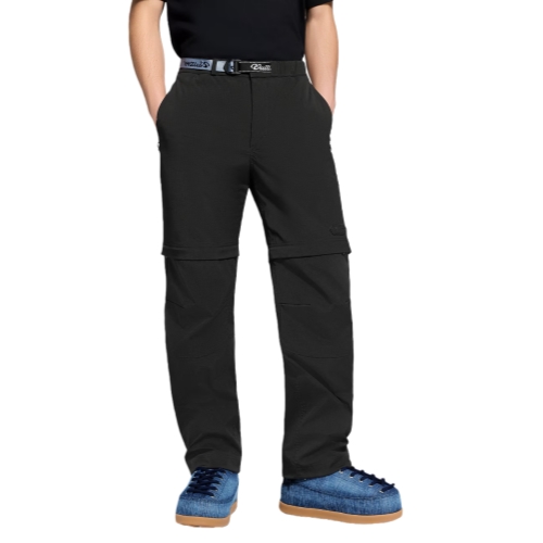 These 2-in-1 convertible technical ripstop pants are lightweight, easily packed and adaptable. The sporty black design can be transformed with zippers into shorts. A rubber Vuitton patch adorns the left leg, while the comfortable waist features a Vuitton-signed elastic strap belt. These versatile pants elevate outdoor activities and can also be styled with everyday looks.