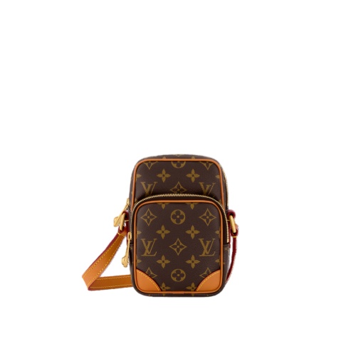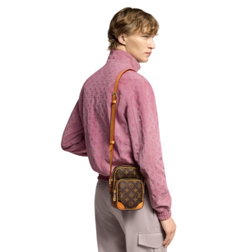 The Amazone is a stylish cross-body bag made from Monogram canvas with aged leather corners, piping, and removable strap. Inspired by designs from the 1980s, Pharrell Williams creates a compact bag that blends vintage charm with modern sophistication. The zip-pulls are adorned with pearl. The adjustable strap ensures comfortable carry.