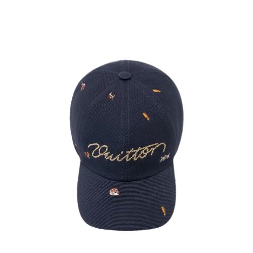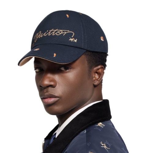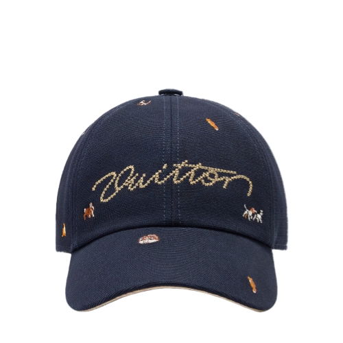 The Animal Blason cap is a playful style that elevates the everyday. The cotton navy hat is embroidered with a variety of small creatures, and on the front is a cross-stitched, handwritten "Vuitton" signature in light gold. For comfort and style, the adjustable back features the "LV Lovers" signature.