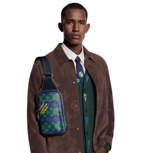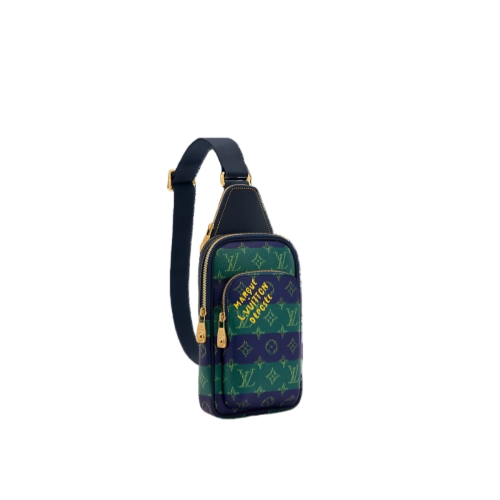 Fashioned from striped Monogram Heritage coated canvas with blue-leather trim, this Avenue Slingbag PM is a practical small bag. This cross-body bag has a zipped main compartment, lined in saffron-colored textile, and a convenient front zipped pocket. For smaller belongings, there’s a triangular pocket attached to the top of the bag where it meets the strap.