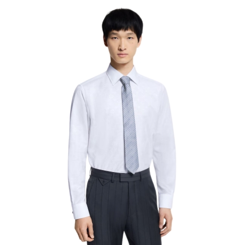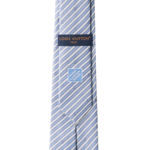 Crafted from 100% silk, the LV Blason tie achieves its collegiate charm through modest yet handsome elements. A diagonal repeat of blue, grey, and white stripes in a variety of widths is dotted with jacuquard Initials, and it is this simplicity of details that guarantees the style's timeless quality.