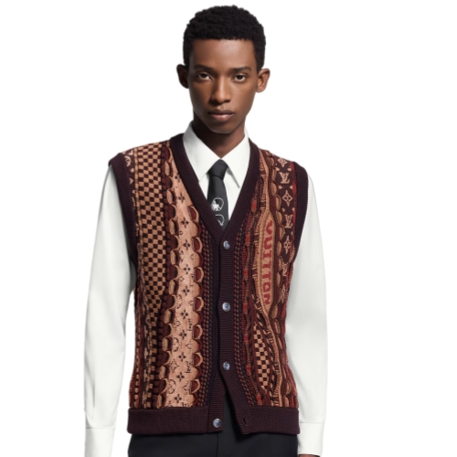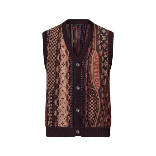 This sleeveless cardigan vest in rich brown tones is adorned with an intricately detailed jacquard from the Fall-Winter 2025 collaboration between Pharrell and Nigo. Inspired by early 2000s urban style, it features an array of House signatures that are integrated into the richly textured knit. With its buttoned fastening, this piece can be styled numerous ways.