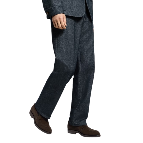 These elegant pants offer a modern twist on tailoring. They are cut from indigo denim in a luxurious wintery blend of cashmere, cotton and wool. Their formal silhouette is accented with jeans-inspired pockets with topstitching and Monogram Flower rivets. Effortless and understated, these pants elevate everyday looks, while a matching tailored jacket makes a contemporary suit.