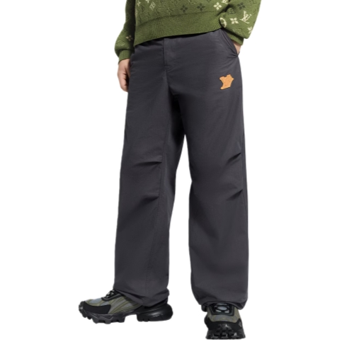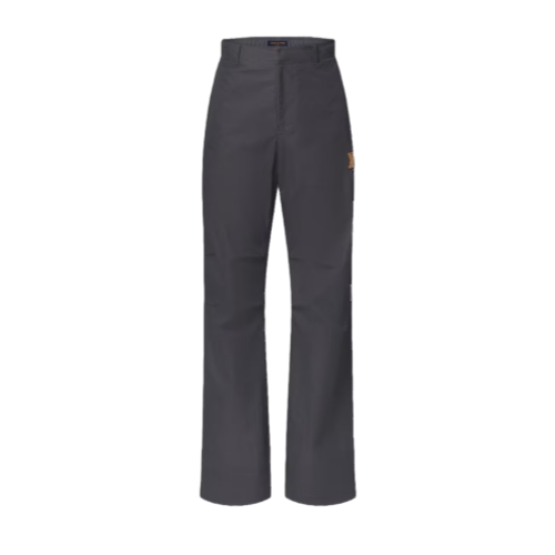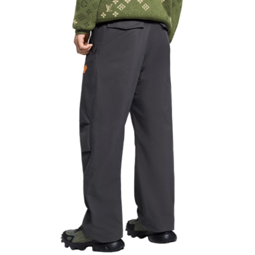 These dark gray casual outdoor pants are perfect for changing mid-season weather, crafted in a technical cotton blend with a silky finish. Comfort is ensured with knee darts for ease of movement and an elasticated rear waist. A VVN-colored leather patch adorned with an embossed LV Flower adds a sophisticated accent to the left leg.