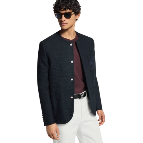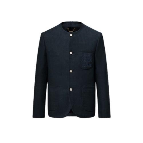This single-breasted navy blue jacket makes an elegant addition to a summery wardrobe with its dandy collarless silhouette and lightweight open weave cotton. Inspired by this collection’s transatlantic cruise, it is adorned with a travel-inspired signature on the chest pocket and mother-of-pearl effect buttons in golden settings, while a woven Marque L.Vuitton Déposée label signs the back.