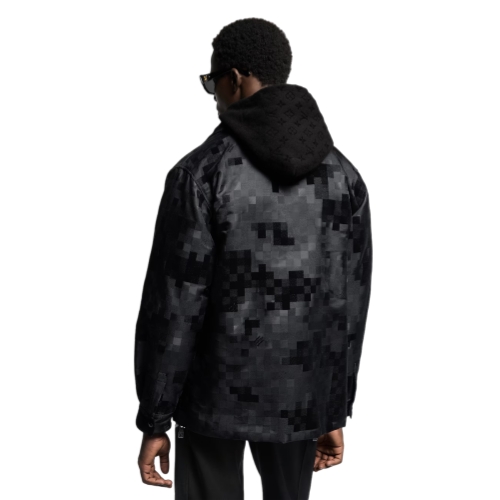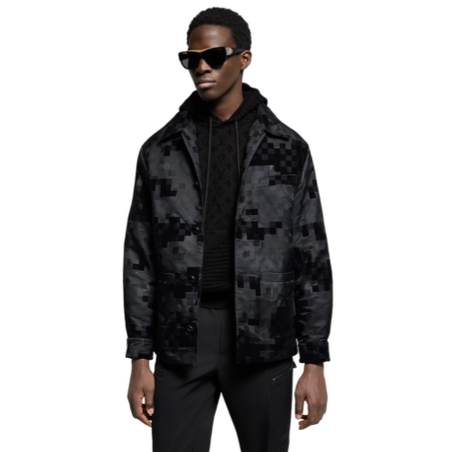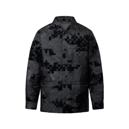 This chic black Damoflage overshirt is a perfect layering option for spring days. The emblematic motif from the Spring-Summer 2025 show is richly executed in a textured jacquard with velvety flock accents and scattered Marque L.Vuitton Déposée signatures. This fully lined piece is finished with black pearl-effect buttons, bringing a sophisticated accent to everyday looks.
